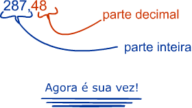 Em todo número decimal há, portanto, uma parte inteira e uma parte decimal. A parte inteira é formada pelos algarismos que estão à esquerda da vírgula e a parte decimal é formada pelos algarismos à direita da vírgula. Por exemplo: