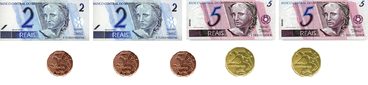 2) João saiu de casa com 2 notas de 2 reais, 1 nota de 5 reais, 7 moedas de 10 centavos, 1 moeda de 25 centavos e 1 moeda de 50 centavos. No total, quanto ele tinha?